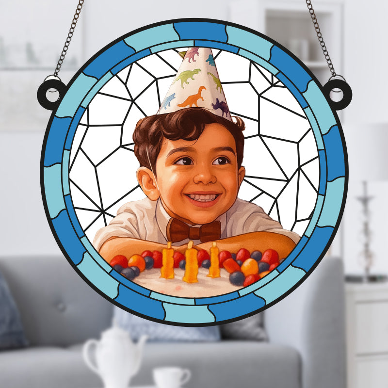 Nuestro Atrapasol Personalizado Estilo Caricatura para Cumpleaños transforma cualquier foto en una divertida ilustración al estilo dibujo animado, impresa sobre acrílico transparente para reflejar la luz con magia y alegría.