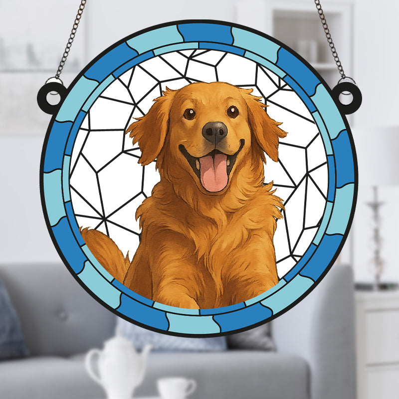 Nuestro Atrapasol Personalizado Estilo Caricatura para Mascotas transforma la foto de tu perro, gato u otra mascota en una divertida ilustración tipo dibujo animado impresa en acrílico transparente.